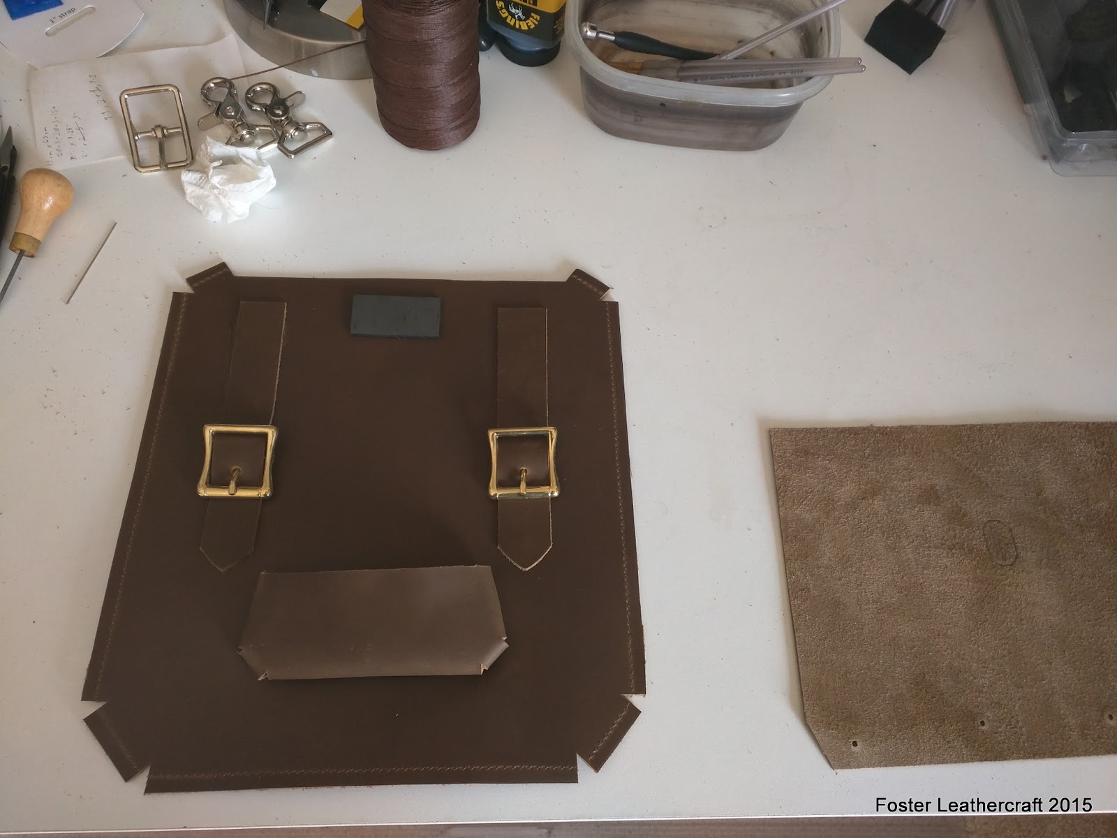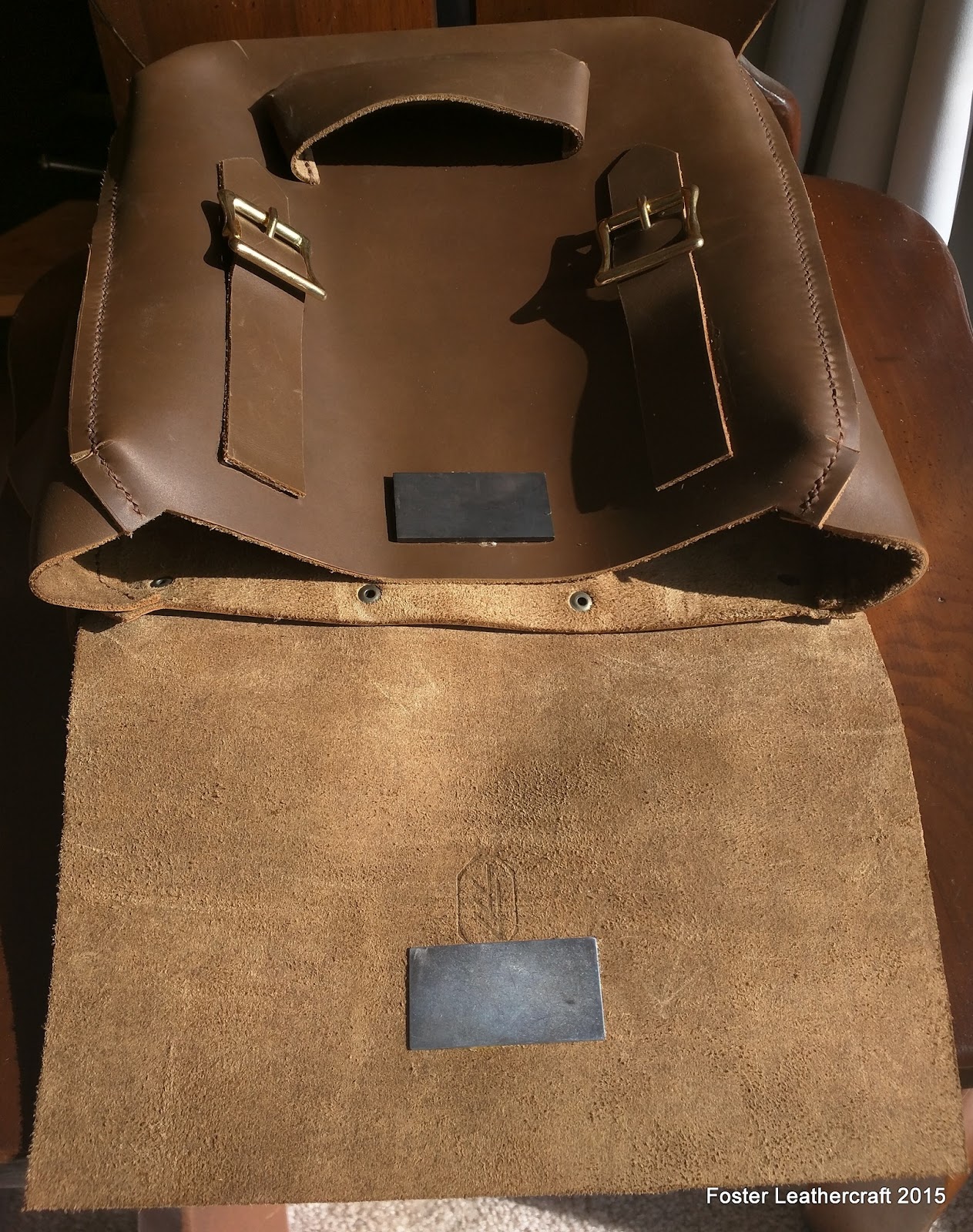 My biggest concern was that the corners would need some sort of reinforcing to hold the angles. As I was stitching the gusset into place though it became clear that that probably wouldn't be necessary. The stoned leather holds the form rather well all on its own. So well that even if it's loaded with a few pounds of weight it doesn't sag. I work with stoned leather practically every week but I was still a bit surprised at how well it molded to the shape.